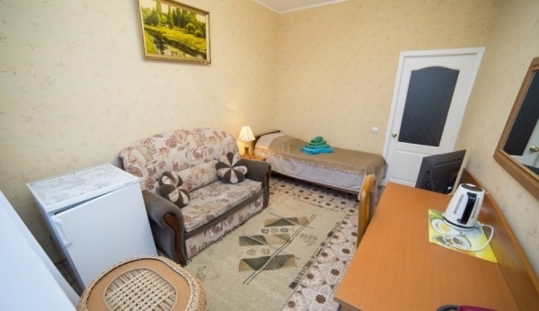 В номере: ванна, туалет, фен, ТВ, холодильник, электрочайник, две раздельные кровати.